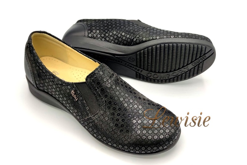 Pohodlná obuv z přírodní kůže na nízkém stabilním klínku s vsazenými gumičkami na nártu pro snadné obouvání.
